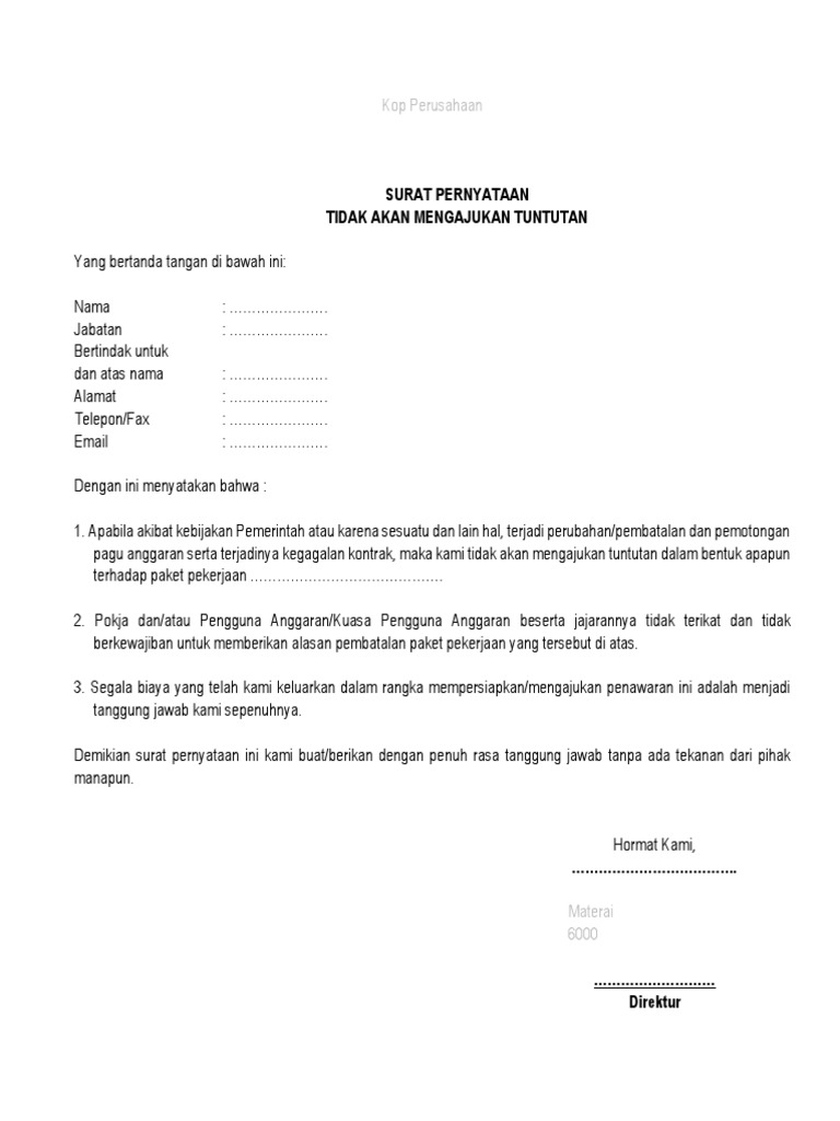 Surat Pernyataan Tidak Pernah Dijatuhi Hukuman Disiplin Tingkat Sedang-Berat from imgv2-1-f.scribdassets.com Surat pengantar ini jika disiapkan lebih dahulu akan lebih baik, walaupun kadangkala tidak diperlukan. Yang bertanda tangan di bawah ini berikut prosedur mendapatkan surat keterangan tidak sengketa seperti dikutip sipp kemenpanrb. Adakalanya urusan administrasi atau prosedur tertentu membutuhkan surat keterangan. Surat keterangan tidak mampu merupakan surat yang dibuat untuk menyatakan atau menerangkan bahwa seseorang kurang mempunyai kemampuan atau kelebihan dalam aspek materiil di kehidupannya. Surat keterangan adalah salah satu yang penting saat melakukan magang di sebuah perusahaan. Tidak pernah ada pengaduan dari masyarakat, bahwa yang bersangkutan melakukan pelanggaran terhadap norma dan hukum yang berlaku. Biasanya surat ini dibutuhkan dalam pengajuan pinjaman, pembelian rumah dengan sistem angsuran dan lain sebagainya. Biasanya juga terdapat peraturan yang berbeda dari pdam di setiap daerah yang harus diikuti untuk dapat berlangganan air bersih.